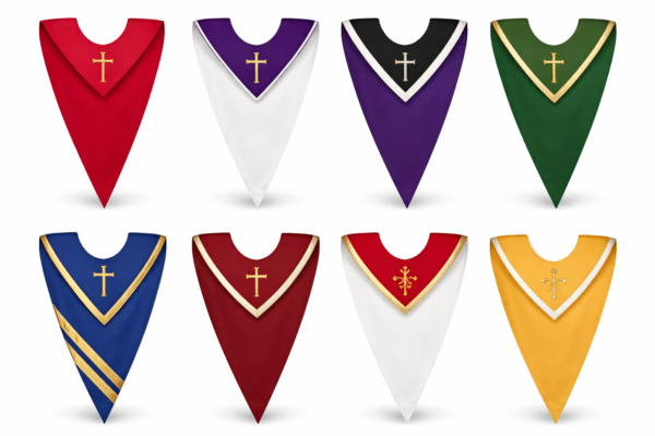 This V-shaped cape (also known as a choir stole) is worn over choir robes to give a more distinguished and professional look during ministrations, services, and special church events.