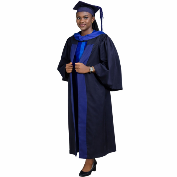 Elegant and professional graduation gown set for ladies, designed with a rich black fabric and royal blue front panel.